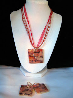 This is a bit of a complicated pendant and earrings. It's made from a polymer clay http://www.beadsandbeading.com/blog/polymer-clay-tutorial-mixed-media-art-sheets-technique-video/11266/'>mixed media art sheet I had a lot of fun doing it. Just use your imagination and be creative. i then used easy cast resin to give it that domed glass like look. I used copper with it as it seemed to look best and made a little decorative embellishment with the copper wire in front of the pendant. I also found this beautiful coral colored ribbon cord that just echoed the colors in the pendant.